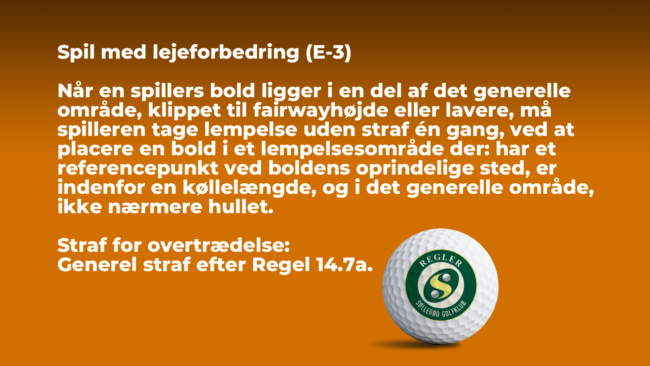 Der indføres lejeforbedring som anført herunder fra 3. juli og indtil videre. Teksten fremgår også af klubbens scorekort m.m. Spil med lejeforbedring (E-3) Når en spillers bold ligger i en del af det generelle område, klippet til fairwayhøjde eller lavere, må spilleren tage lempelse uden straf én gang, ved at placere en bold i et…